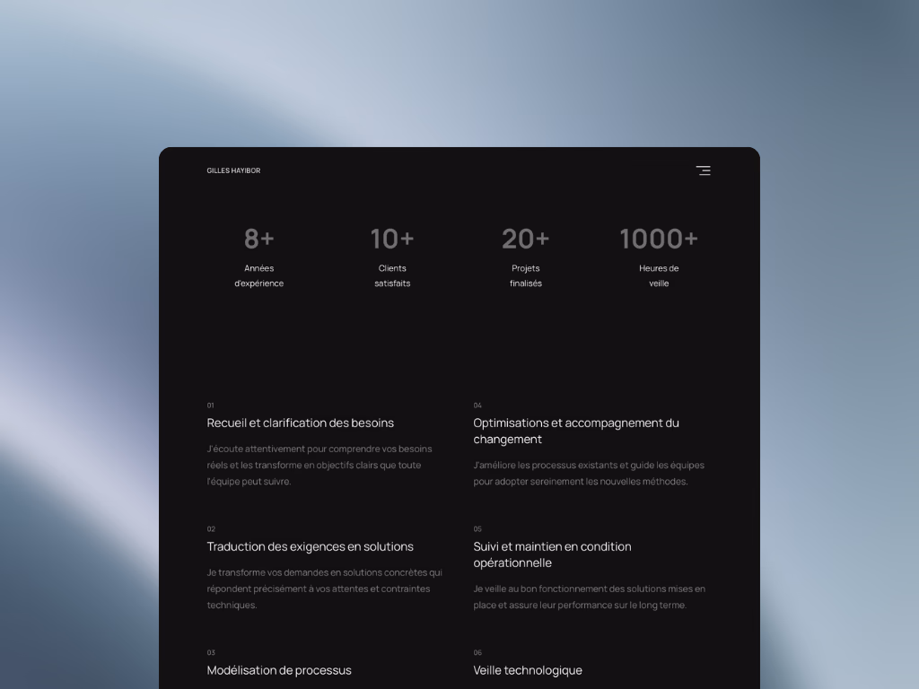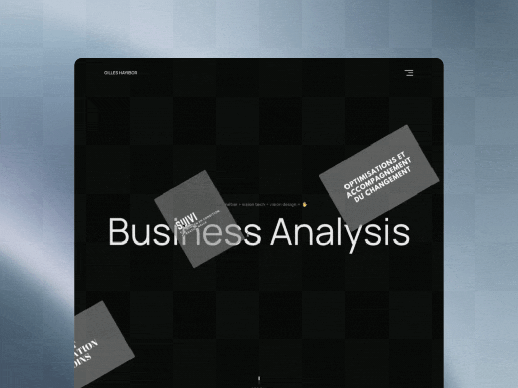 Le client avait besoin d'un site professionnel pour valoriser son expertise en business analysis et attirer de nouvelles missions. L'objectif : créer un portfolio moderne présentant ses réalisations, avec un blog pour partager ses connaissances et améliorer son référencement naturel sur des requêtes métier.